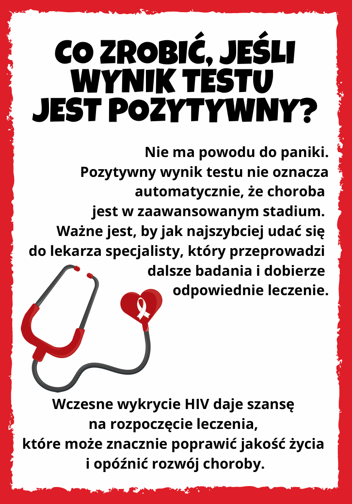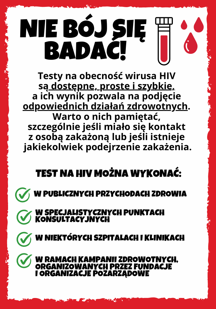 HIV może dotyczyć każdego, niezależnie od płci, wieku, orientacji czy stylu życia. Wiele osób wypiera ten fakt i nie robi testu. Warto, aby wykonała go każda dorosła osoba, która choć raz w życiu miała ryzykowne zachowanie. W sieci Punktów Konsultacyjno-Diagnostycznych (PKD) można zrobić to badanie bez skierowania, bezpłatnie i anonimowo. Punkty PKD działają we wszystkich województwach. Ich lista dostępna jest na stronie https://pkd.aids.gov.pl.