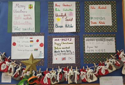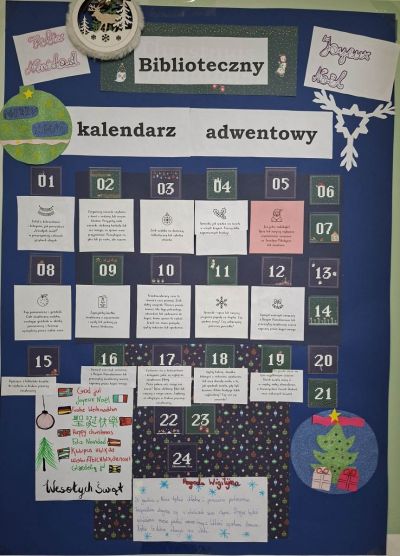 W oczekiwaniu na święta biblioteka szkolna zaproponowała uczniom włączenie się w zabawę z Bibliotecznym Kalendarzem Adwentowym. W ramach zadań uczniowie min. wykonywali ozdoby na biblioteczną choinkę, czytali świąteczne wiersze, pisali życzenia świąteczne w językach obcych, opisywali pogodę na Wigilię oraz zwyczaje świąteczne w różnych krajach. Zabawa czytelnicza odbywała się w ramach ogólnopolskiego programu „Biblioteka – dobre miejsce dla człowieka”.
